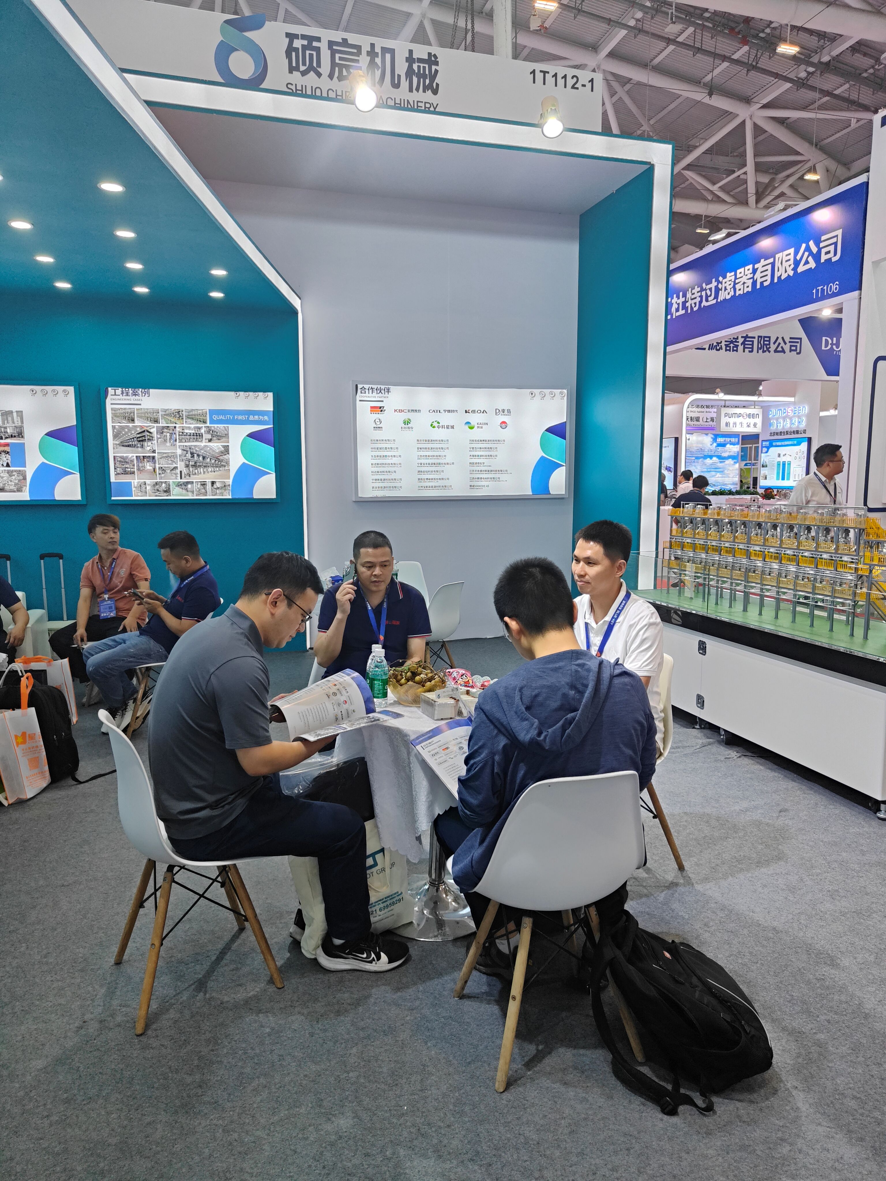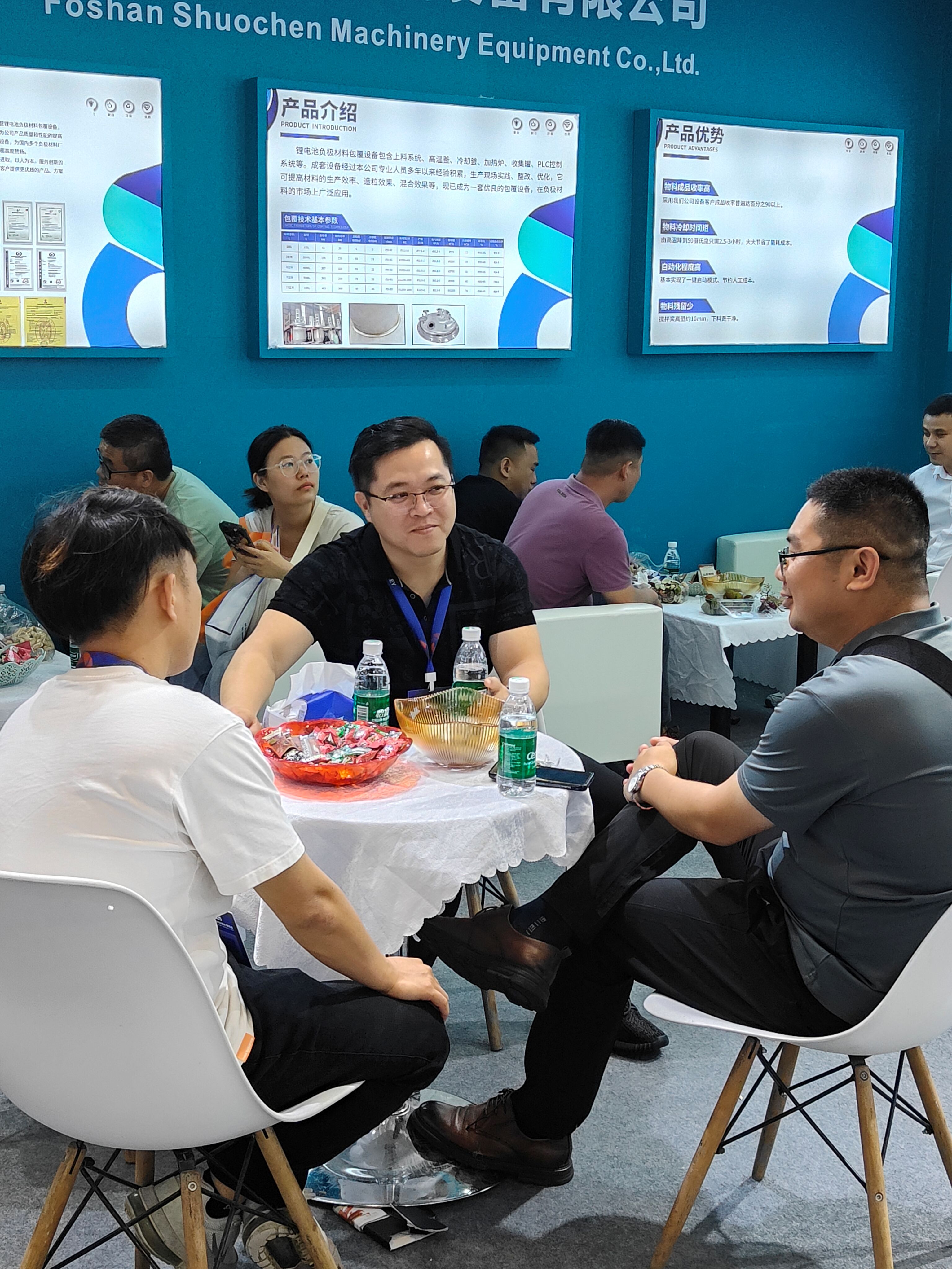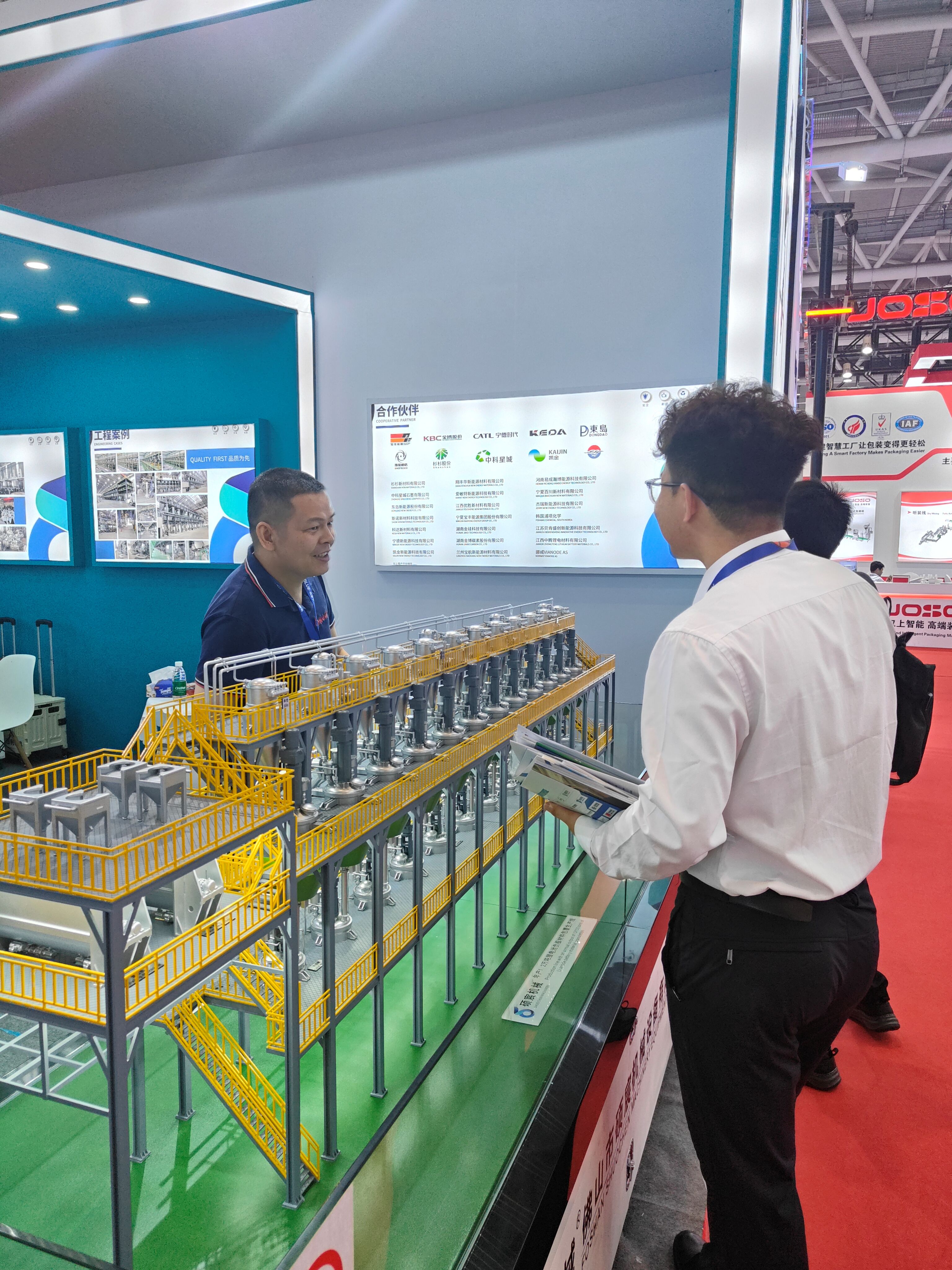產品展示環節,更是將現場氛圍推向高潮。工作人員化身 “專業(yè)講解員”,通過微(wēi)縮生產案例的(de)模型實物展示,向客戶全方位介紹公司的鋰電池負極材料包覆設備(bèi)。從設備的組成、設計優點,到卓(zhuó)越的安全性能和智能化管理(lǐ)係統,每一個細節都被詳細解(jiě)讀。為了讓客戶更直觀地感受產品優勢,現場還設置了互動體驗(yàn)區,客(kè)戶可以親自操作搭載公司電池的設備,切身體驗產品帶來的便捷與高效。
