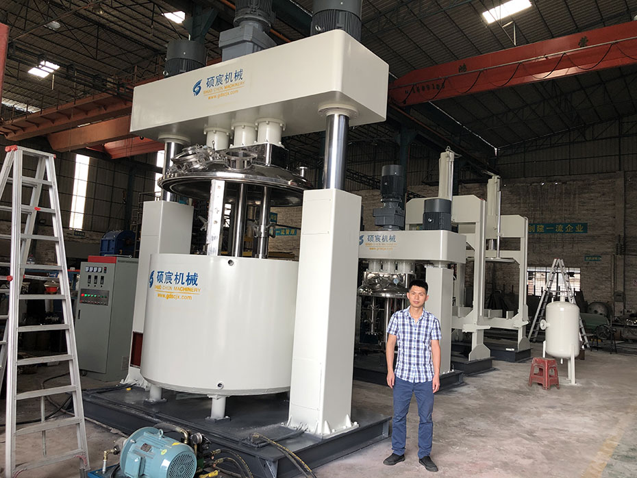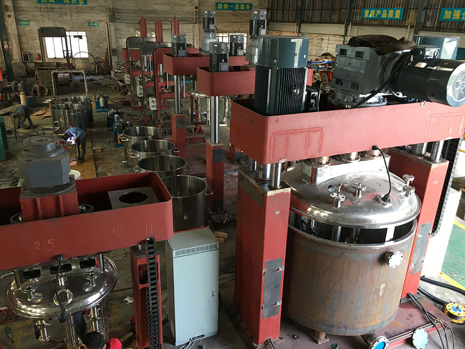 其中強力分散機(製膠機)是矽酮密封(fēng)膠、玻璃膠、結構膠的生產設備中的主要組成(chéng)部分,也是矽酮膠、玻璃膠的整條生產線中為重(chóng)要設備部分。強力分散機是一種快速攪拌機,有三個動力(lì)驅動的電動機,釜內有三根不同(tóng)形式、高低速結合的攪拌器;是一種應用行業廣泛、密封性好、可抽真空、具有良好(hǎo)的脫泡效果、攪拌無死(sǐ)角、高低(dī)速結合(hé)、攪拌分散充分快速的混合攪拌設備。若想要了解(jiě)更多的工況,您可以提出您所需要的處理量、設備形式、規格要求或您需要加(jiā)工的(de)物料的性質,根據您的情況91成人app的銷售工(gōng)程師會提供讓您滿意的方案。